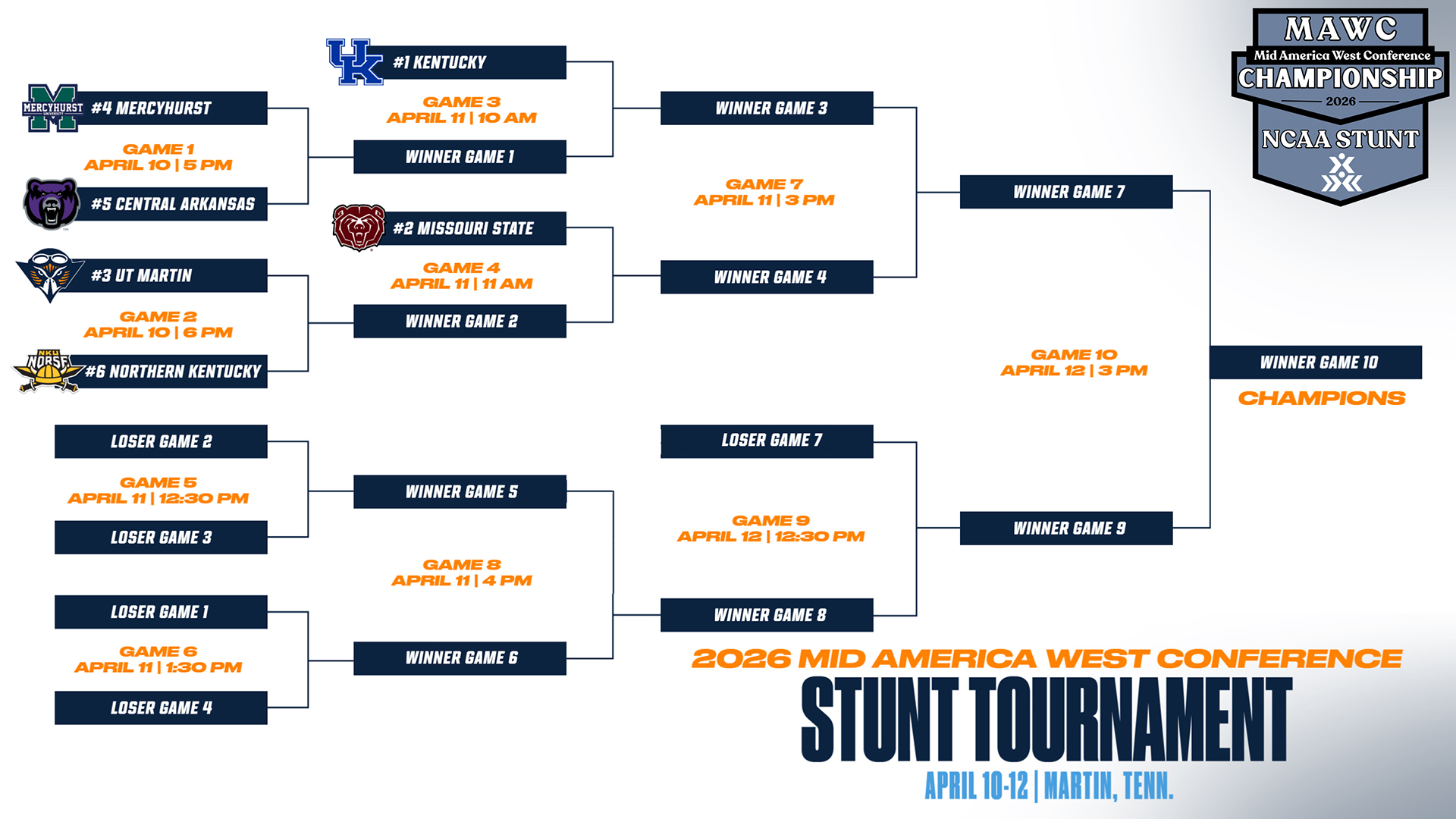 The Mercyhurst STUNT team enters the Mid America West Conference Championship with a 12-5 overall record and a 3-2 conference record. They will face No. 5 Central Arkansas to begin the tournament on Friday, April 10. Their next game is dependent on if they win or lose. They will either play No. 1 Kentucky in the second round or drop to the loser's bracket. There is still a path to the final from the loser's bracket.Â
